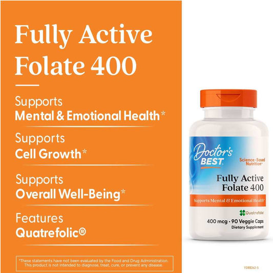 Doctor's Best Fully Active Folate 400 with Quatrefolic, 400 Mcg, 90 Veggie Caps