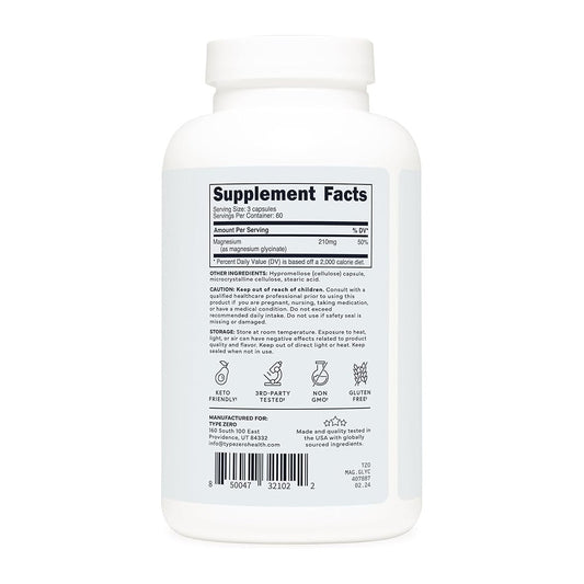 TYPE ZERO CLEAN MAGNESIUM GLYCINATE 210mg Per Serving Non-GMO Third-Party Tested