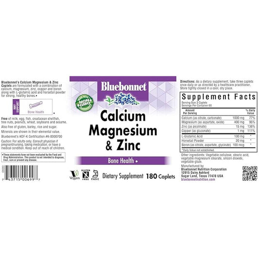 Bluebonnet Calcium Magnesium & Zinc 180 Caplets – Bone Strength & Immune Support