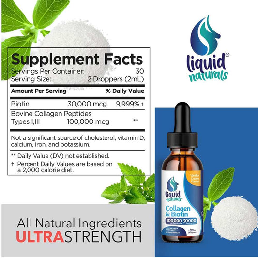 Liquid Naturals Collagen & Biotin – 100,000 Mcg + 30,000 Mcg | Ultra Strength Liquid | 2 Fl Oz