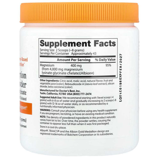 Doctor's Best High Absorption Magnesium Powder Lysinate Glycinate 100% Chelated, 400 Mg per Serving, Fruit Punch, 340g