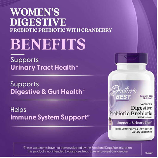 Doctor's Best Women's Digestive Probiotic + Prebiotic with Cranberry 4 Billion Cfu Veggie Caps 30 Count