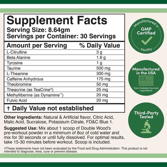 Double Wood Pre-Workout DWS – 175mg Caffeine & Multi-Ingredient Performance Formula | 30 Servings