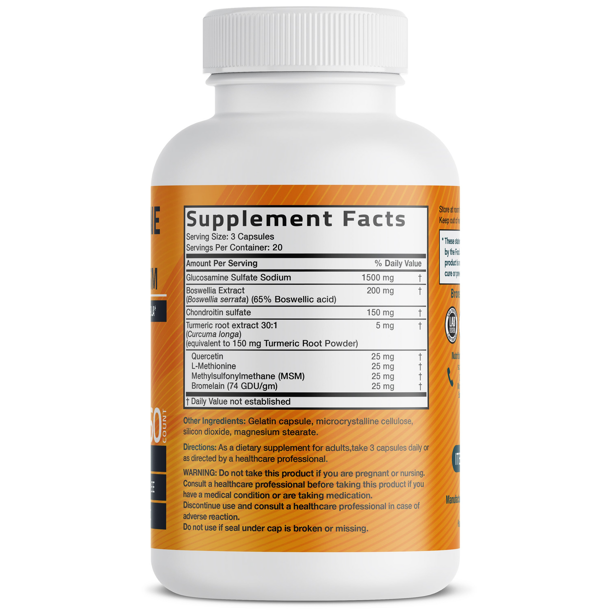 Bronson Vitamins Glucosamine Chondroitin Turmeric & MSM 60 Caps is formulated with top rate elements like glucosamine, chondroitin, turmeric, MSM, and Boswellia to help wholesome joints, mobility, and typical consolation.* This superior joint help components is Non-GMO and thoroughly synthetic in Bronson`s New York facility for high-satisfactory and potency.* Shellfish-loose glucosamine makes it secure for maximum users.* Ideal for preserving joint fitness and selling flexibility.* Supports day by day consolation and energetic lifestyles.*
