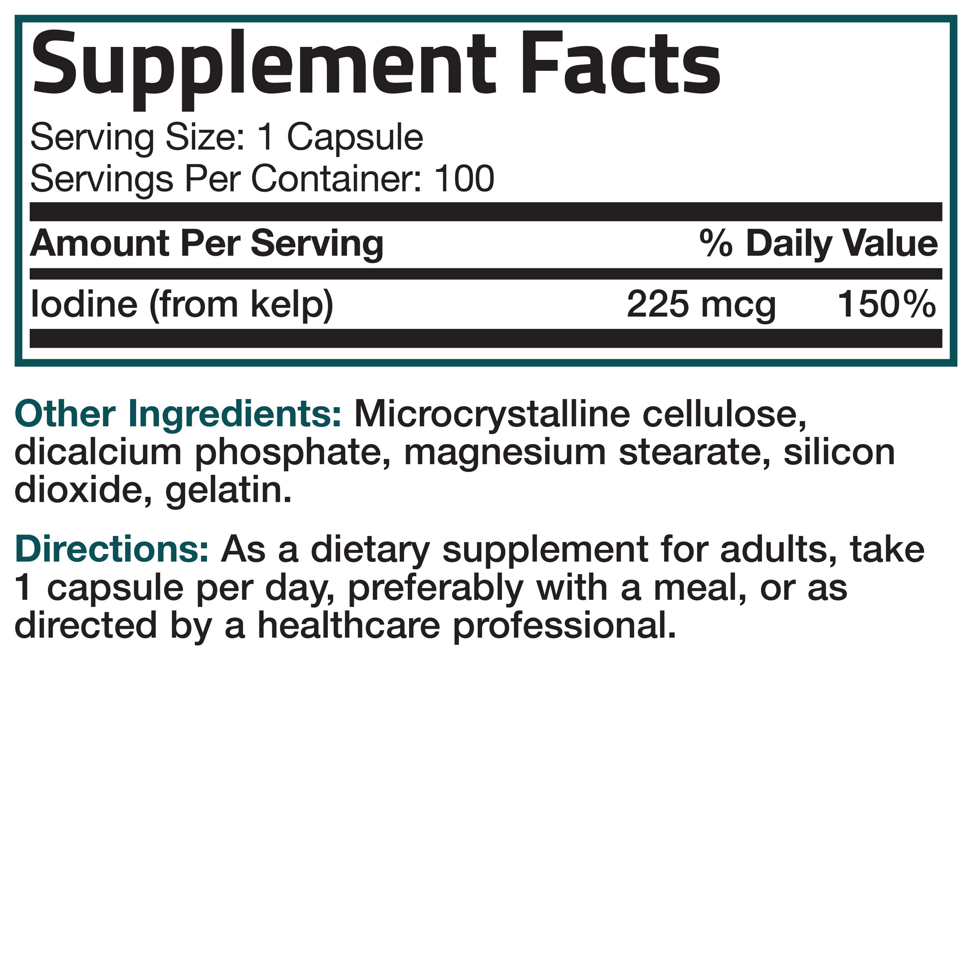 Bronson Kelp Iodine offers 225 mcg of iodine in keeping with tablet from herbal kelp, a nutrient-wealthy seaweed. Iodine helps wholesome thyroid feature and typical increase and development.* This complement additionally offers vital minerals like iron, potassium, and magnesium. Each tablet is cautiously made for each day use to guide typical well-being.*