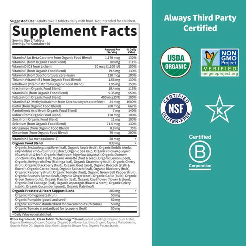 Garden of Life Organics Men's Multi 40+ a hundred and twenty Tablets in Pakistan is an entire meals multivitamin mainly designed for guys over 40. Made from licensed natural fruits, vegetables, and herbs, it presents centered assist for prostate, coronary heart, and normal health. With 20 nutrients and minerals, together with pretty absorbable B-12, and a mix of natural elements like pomegranate, pumpkin, turmeric, and tomato, this multivitamin facilitates guys keep energy, vitality, and health. It consists of no delivered iron and is Certified USDA Organic and Non-GMO Project Verified.