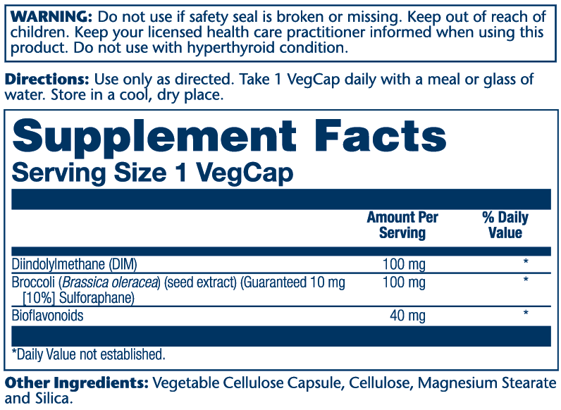 Contains one hundred mg DIM plus one hundred mg broccoli seed extract with sulforaphane