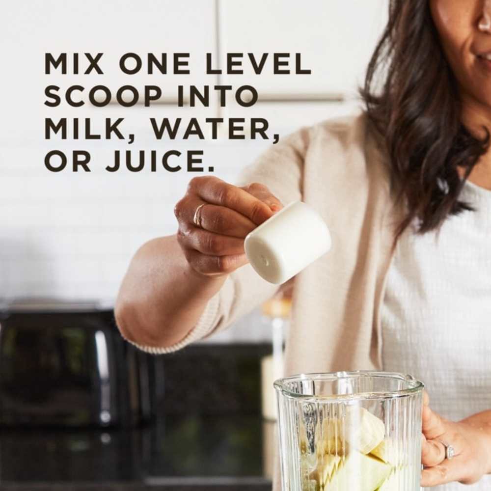 For adults, blend 29 grams (1 leveled scoop) in eight oz of water, milk, or your preferred juice and mix or shake vigorously.